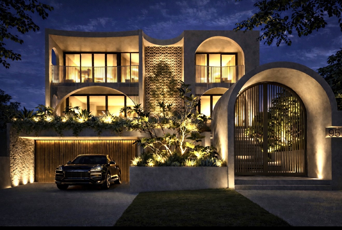 Modern façade, 8 car basement, 5 bedrooms, Elevator, Kitchen and butler’s pantry, MPR and study, Wine cellar, Large balconies/verandah, Large void areas which create very high ceilings, Large pool and alfresco area